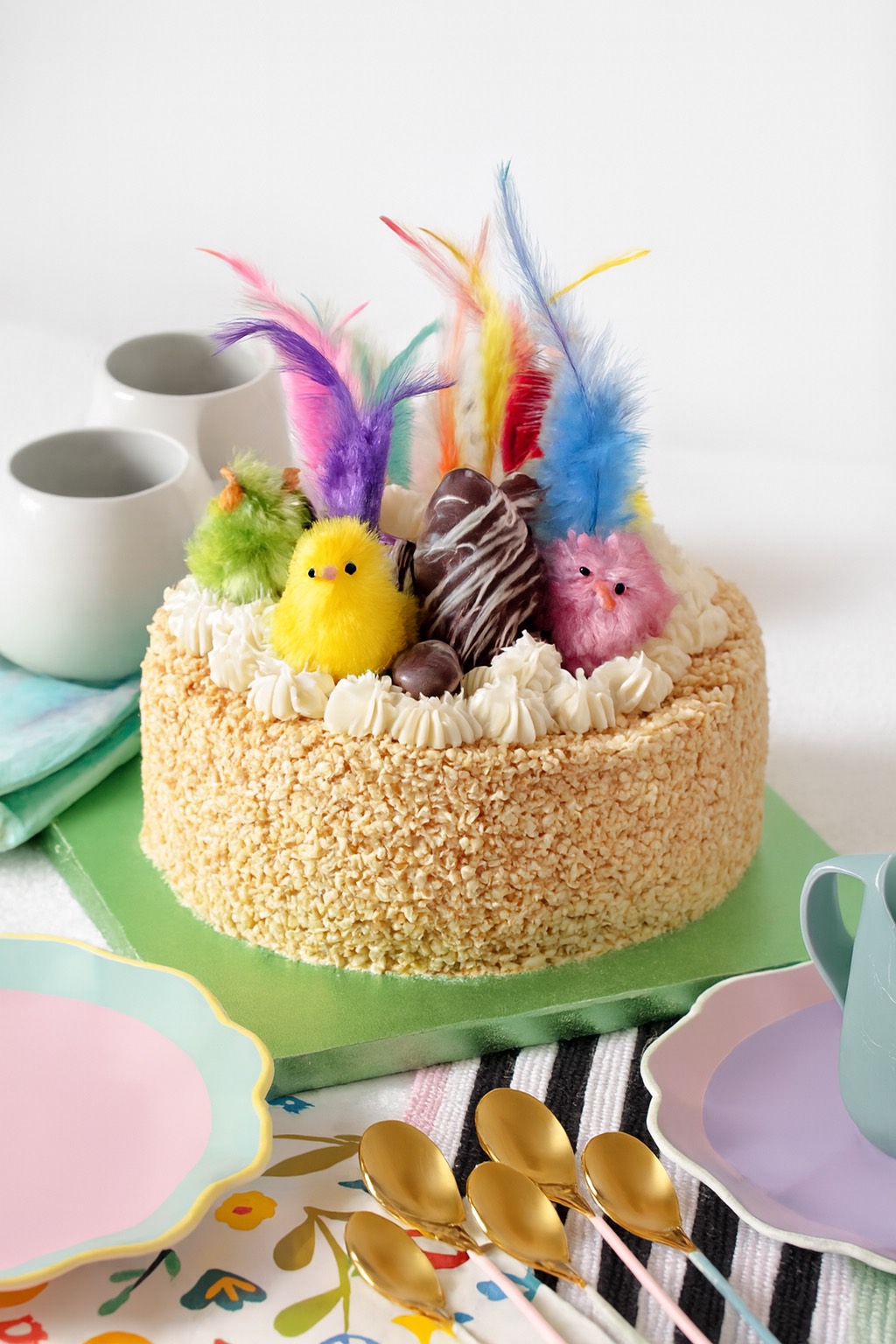 Pastís cruixent i esponjós, decorat amb nata, pollets de colors i ous de xocolata. Un disseny alegre i primaveral, ideal per celebrar la Pasqua amb un toc divertit.