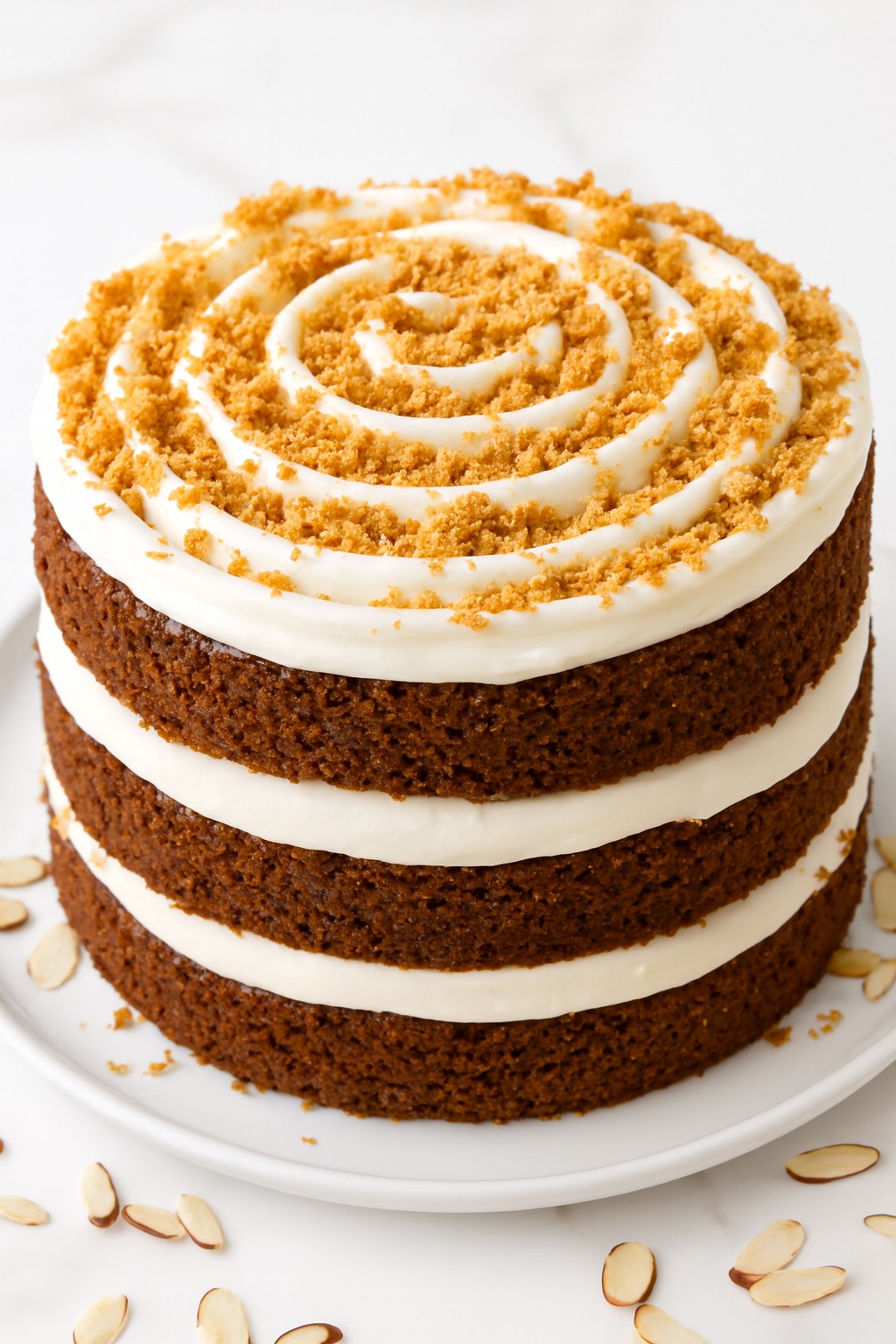 Pastís de quatre pisos amb capes visibles de bescuit i crema, acabat amb un toc cruixent al damunt. Un estil natural i refinat, perfecte per a celebracions amb un aire més artesanal.