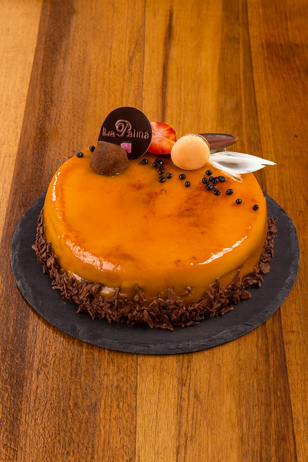 Pastís amb cobertura caramel·litzada brillant, base de xocolata i decoració gourmet amb trufa, macaron, maduixa i detalls de xocolata. Un estil refinat i perfecte per a ocasions especials.