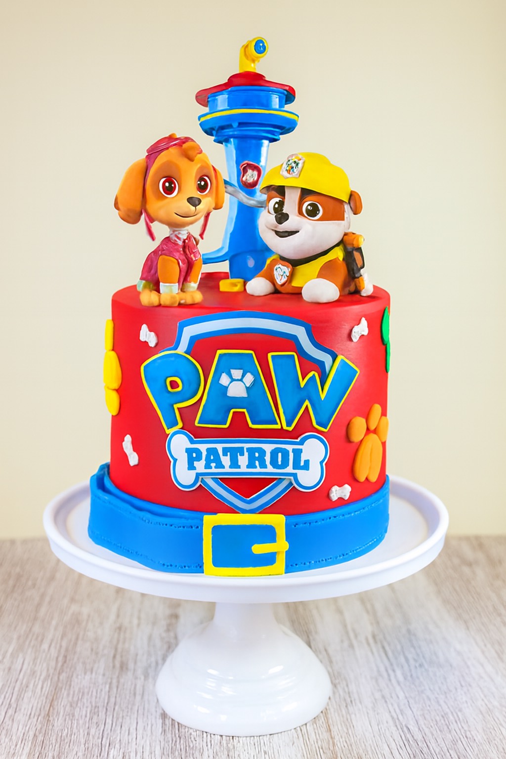 Pastís infantil súper colorit amb figures de Skye i Rubble, torre central i detalls de petjades i ossos. Perfecte per a fans de PAW Patrol que volen una celebració divertida i plena d’aventura.